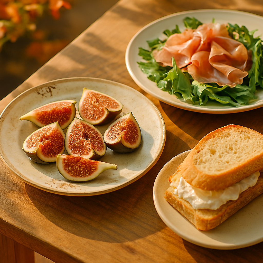깨끗이 씻은 루꼴라와 어린잎 채소를 접시에 깔고, 4등분한 무화과와 프로슈토를 올립니다. 리코타 치즈나 부라타 치즈를 곁들인 후, 발사믹 글레이즈와 올리브 오일을 살짝 뿌려주면 와인과 잘 어울리는 고급스러운 샐러드가 완성됩니다.